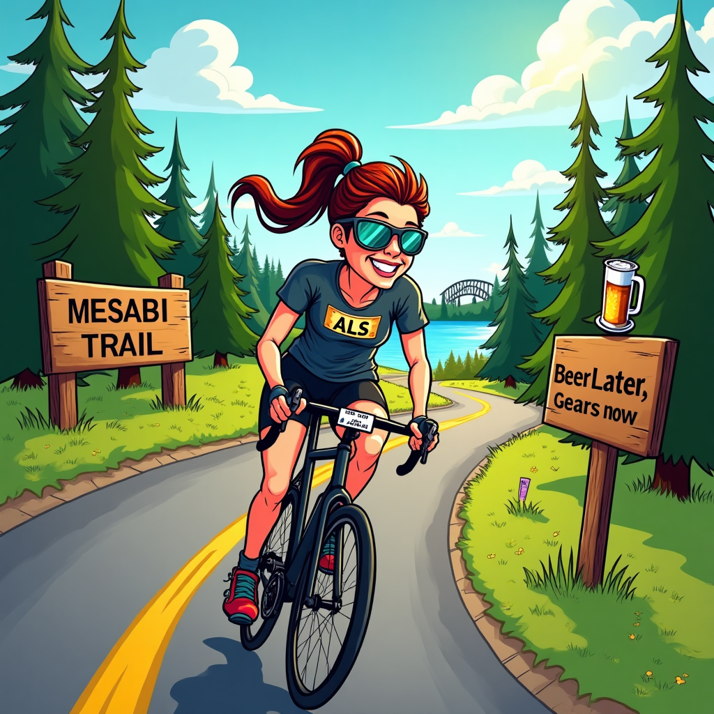 Playful, funny cartoon scene in bright, saturated colors with thick black outlines: a female bike rider with an oversized grin and sporty sunglasses zooms downhill on a sunlit paved trail with a yellow centerline, hair ponytail streaming, big energetic motion lines and celebratory starbursts; Minnesota vibes with pines, birches, a blue lake, and a distant iron range headframe silhouette. A rustic wooden sign by the trail clearly reads MESABI TRAIL in bold. The rider’s jersey shows a visible race bib/patch marked ALS. In the bike’s bottle cage, a can labeled BEER glints with a cheeky sparkle. Add one small, witty caption on a ribbon at the bottom: “Beer later, gears now.” Exaggerated proportions, whimsical details, portrait orientation, large central character, upbeat and humorous mood.