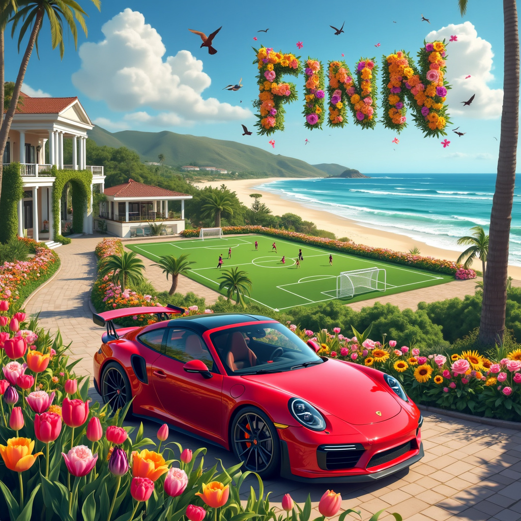 Generated with these themes: Football, Porsche, Mansion, Beach house, Rolling green hills, and Flower bed.