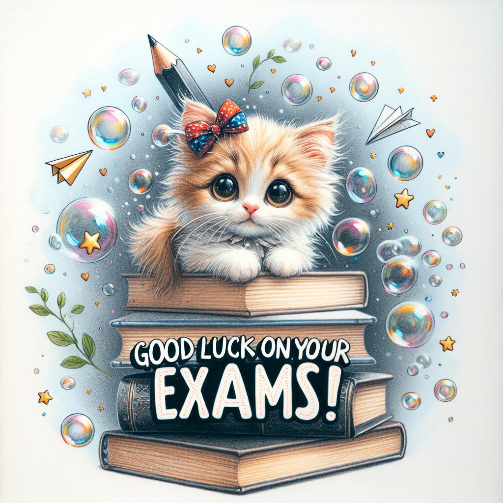 Create a captivating image that shows a bright-eyed kitten with a small pencil tucked behind one ear, perched on top of a stack of textbooks. The kitten is engulfed in a cloud of floating hearts and bubbles, symbolizing a playful atmosphere. In the forefront, the phrase 'Good Luck on your Exams!' appears in an informal handwritten style, adding to the theme of academic pursuit. Scattered in the backdrop are tiny stars and paper airplanes, implying a mix of diligent study and joyful accomplishment.