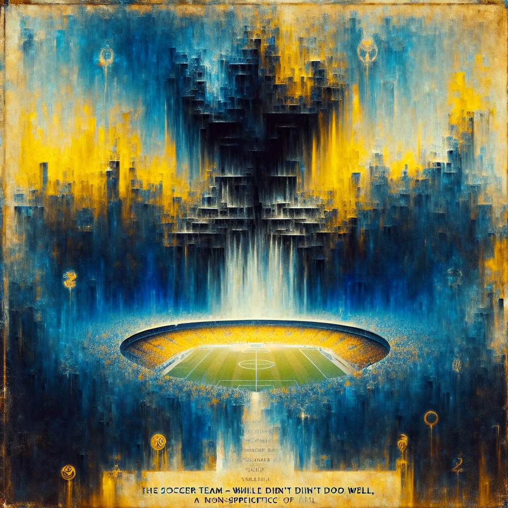 Visually experience a surreal abstract piece, bathing the canvas with dominating hues of blue and yellow, symbolizing an almost touchable aura of melancholy. The central motif is an impressionistic representation of a renowned soccer stadium emerging from the abstract, yet gloomily veiled by a mystical narrative of a non-specific curse, casting a somber mood over the scene. Subtle symbols resembling a sports team's emblem, weathered and aged, are scattered throughout, incorporated with bold and satirical text saying 'The Soccer Team Didn't Do Well.' This work, while subtly congratulating the viewer on their accomplishments, conveys the stark dichotomy of emotions experienced during a lost pivotal soccer match, encompassing the lingering essence of sorrow post-defeat.
