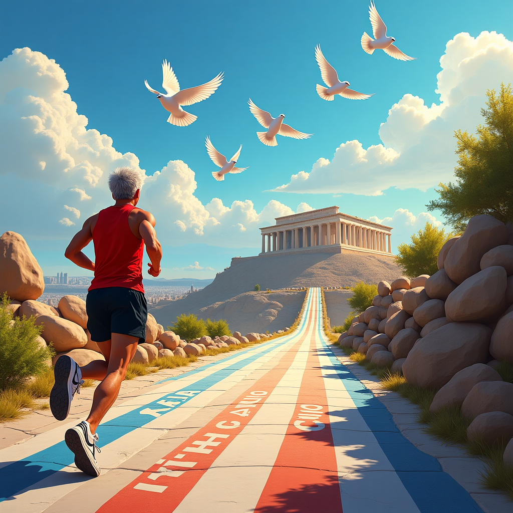 Generated with these themes: Athens, acropolis, Greek flag, Congratulations. You did it!, Runner with grey hair, no beard wearing red vest, black shorts and white trainers, Marathon finish line, and Show the back of the runner with Hermes winged trainersith .