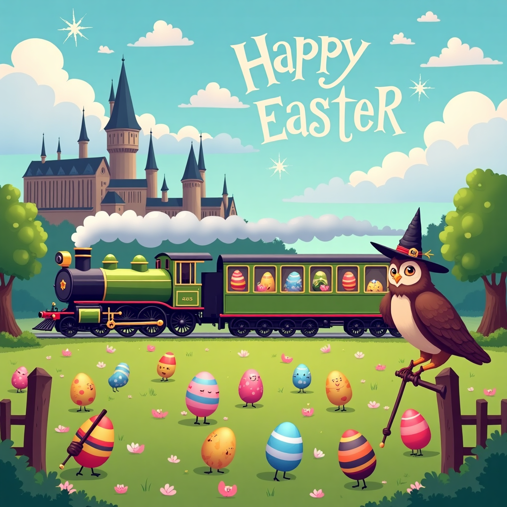 In front of the train, a lively scene unfolds. Easter eggs, painted with tiny Hogwarts house crests, are scattered across the lush green grass, each egg sporting a pair of cute little feet and a mischievous grin. Some are perched on tiny brooms, whizzing about in playful pursuit of one another. Nearby, an array of wands is stuck upright in the ground, each casting a different color of light, illuminating the scene like a magical Easter egg hunt.