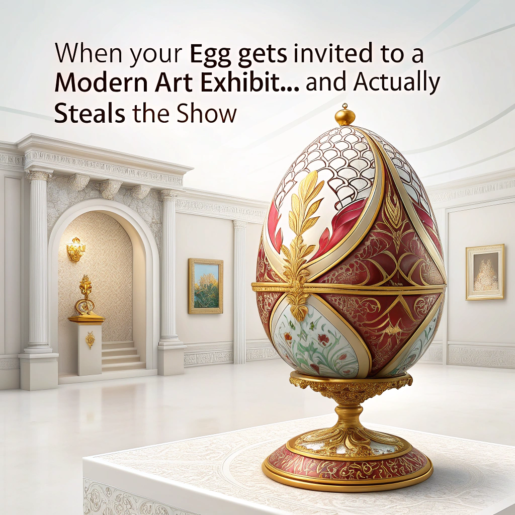 At the top of the image, "When your egg gets invited to a modern art exhibit... and actually steals the show."