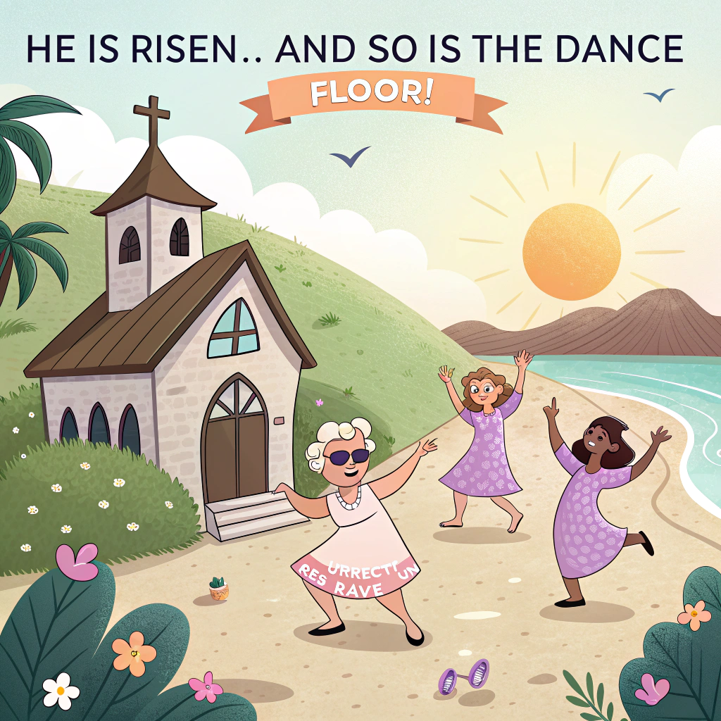 - In the center, a group of joyful, middle-aged church ladies in pastel dresses are busting out disco moves with wild abandon. They’re mid-boogie under a banner that reads “Resurrection Rave.”