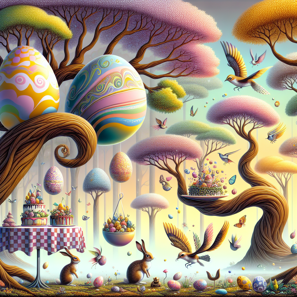 A magical forest scene is unfolding with trees bending in extraordinary ways and leaves showcasing a brilliant array of colors. Oversized pastel-colored eggs teeter on the uniquely shaped branches. Small animals bearing distinctive, captivating eyes are playing under the trees. Birds sporting multiple wings glide through the sky, trailing sparkling dust behind them. Patterned rabbits are at a unique picnic on a floating checkered cloth just above the soil. On the table are eye-catching, levitating cakes filled with colorful and unusual shapes. Rapidly blooming flowers pepper the landscape, each opening to expose an intricate minuscule scene within.