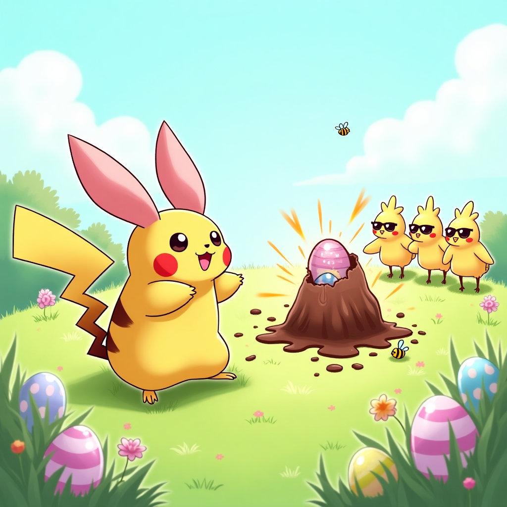 A humorous and colorful Easter scene featuring Pikachu dressed as the Easter Bunny, complete with oversized pink bunny ears flopping sideways and a fluffy tail awkwardly pinned to his lightning bolt-shaped tail. He's energetically zipping around a grassy meadow, accidentally zapping a giant pile of chocolate eggs with his electricity—causing them to explode into a splattered mess of gooey rainbow chocolate. Nearby, a flock of confused pastel-colored chicks with slightly frazzled feathers watch in disbelief, holding tiny sunglasses. In the background, a cracked open Easter egg reveals a miniature Poké Ball inside, glowing with magical light. The scene is filled with springtime details—blooming flowers, buzzing bees, and sun-dappled clouds in the sky—all drawn in a playful, cartoony illustration style.