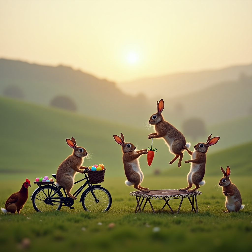 A highly realistic photograph of a sleepy-looking countryside at sunrise, with mist rising over green rolling hills. In the foreground, several mischievous-looking rabbits are caught mid-action: one is riding a miniature bicycle with a basket full of brightly painted Easter eggs, another is using a tiny wooden ladder to reach a hanging carrot, while two more are dramatically caught mid-bounce from a trampoline made of stretched-out suspenders. A chicken stands off to the side, looking baffled. Everything looks photorealistic but arranged in a subtly ridiculous, humorous way, as if a professional wildlife photographer stumbled upon a secret bunny Easter rave in the British countryside.