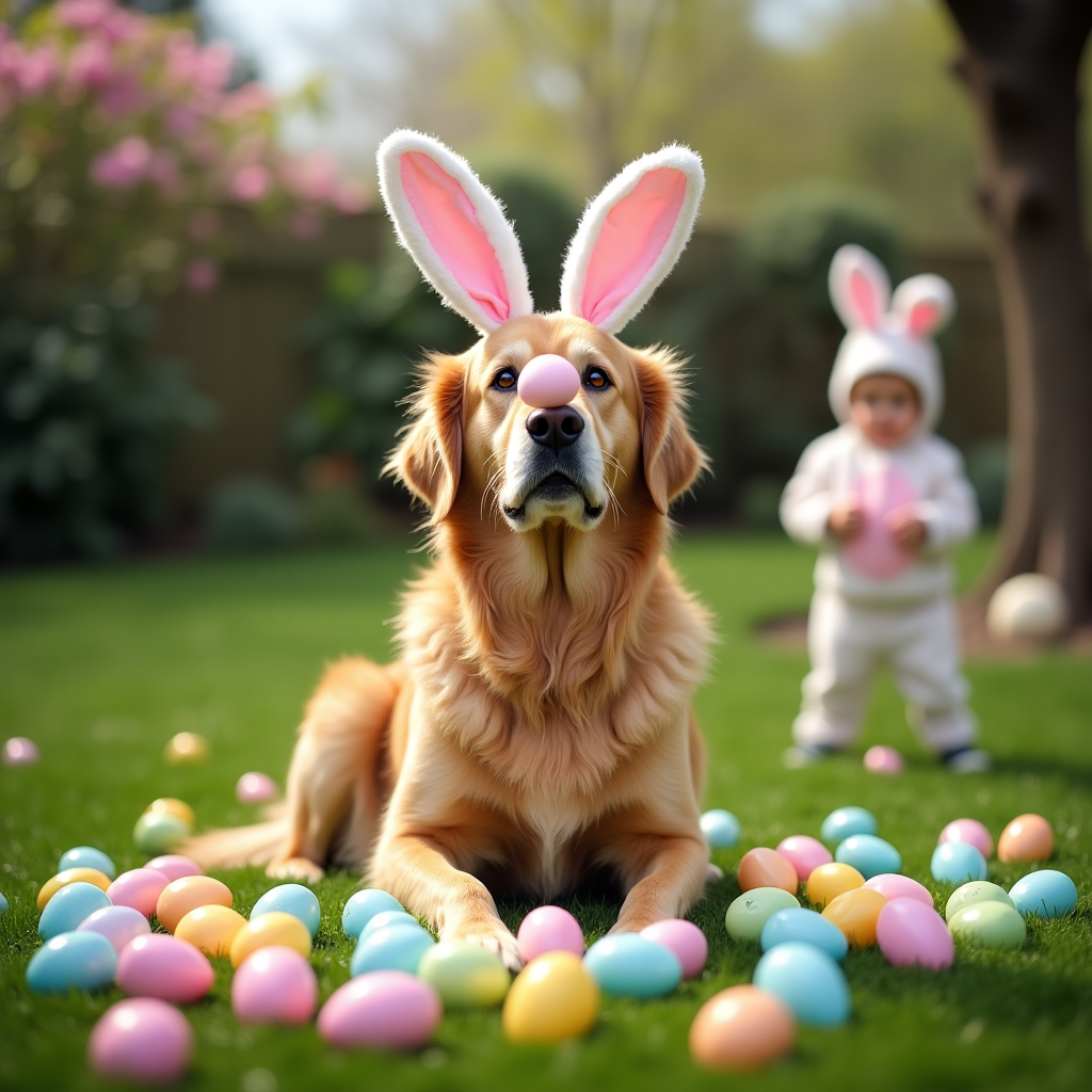 A realistic, high-resolution photograph of a very confused golden retriever sitting in the middle of a lush green backyard, wearing a pair of oversized bunny ears. Around the dog, dozens of brightly colored Easter eggs are scattered, but a few of them are clearly chewed up. One egg is hilariously balanced on the dog's nose. In the background, a small child in a bunny costume is peeking out from behind a tree, looking both amused and shocked. The lighting is soft and springlike, with pastel tones and blooming flowers adding to the Easter atmosphere. The dog has an expression of utter bewilderment, creating a comically adorable focal point.
