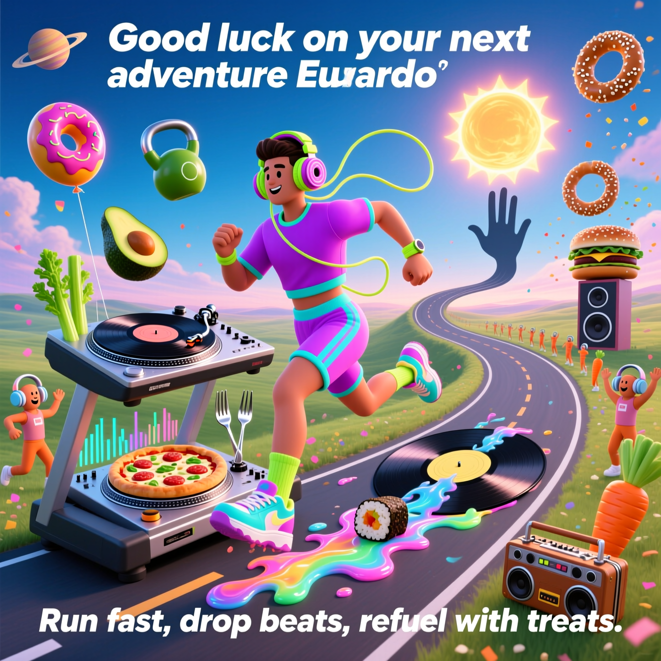 A Dali-inspired, dreamlike landscape where a ribbon-treadmill highway spirals like a giant vinyl record toward a glowing turntable sun. In the center, a stylized runner-DJ in ultra-bright neon athleisure (magenta, cyan, lime) sprints mid-air, donut-shaped headphones on, a spaghetti cable looping like a jump rope. Their melting sneakers leave glossy color trails that morph into a smoothie river. The DJ deck is fused to the treadmill: one platter is a spinning pizza, the other a sushi roll; silver forks serve as tonearms, and celery stalks rise as pulsing EQ bars. Avocado kettlebells orbit like planets, churro barbells curl in the sky, and burger-speaker towers thump out confetti sesame seeds. Floating fruit balloons and cheering carrot coaches in tiny headphones line the path. The treadmill unfurls into a waving hand silhouette as it climbs into the horizon, hinting at farewell, while a suitcase-boombox bounces at the runner’s hip. Ethereal, iridescent lighting, melting edges, elastic perspectives, soft painterly textures, vivid saturated palette. Portrait composition with generous negative space above and below for the text, crisp, legible lettering.