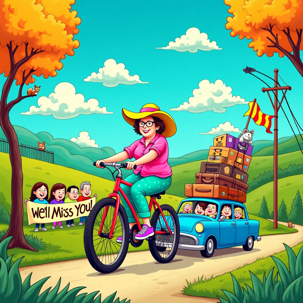 The front cover of the farewell greeting card is a bustling, vibrant cartoon scene teeming with exaggerated and playful details. In the foreground, a sprightly lady, the center of attention, is seen pedaling away on a whimsically oversized bicycle, her head adorned with a flamboyant wide-brimmed sunhat. Her attire is a riot of colors: a neon pink shirt paired with polka-dotted turquoise pants, and vivid purple sneakers. Her bicycle is an elaborate contraption, a vintage-style frame painted in eye-catching cherry red with massive, exaggerated wheels.