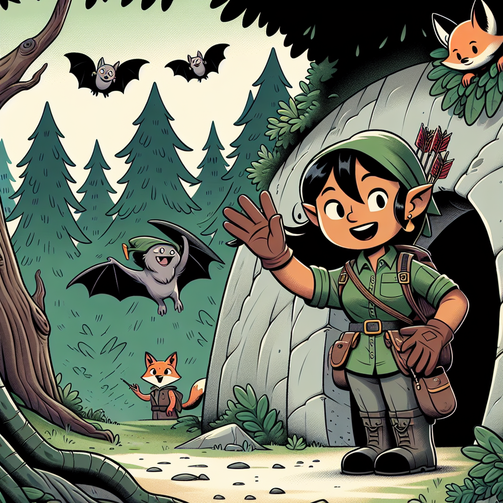 Create a comical illustration of a South Asian female character, styled in spelunking gear, waving goodbye from the entrance of a cave designed to signify the Nottingham Forest. Overhead, bats adorned with Robin Hood hats fly, while a cheeky fox peeks from behind one of the trees, copying the farewell gesture. The forests surrounding the cave are thick and verdant, with subtle humorous details like miniature arrows lodged in the tree trunks, signifying an affectionate yet amusing farewell to a caving enthusiast.