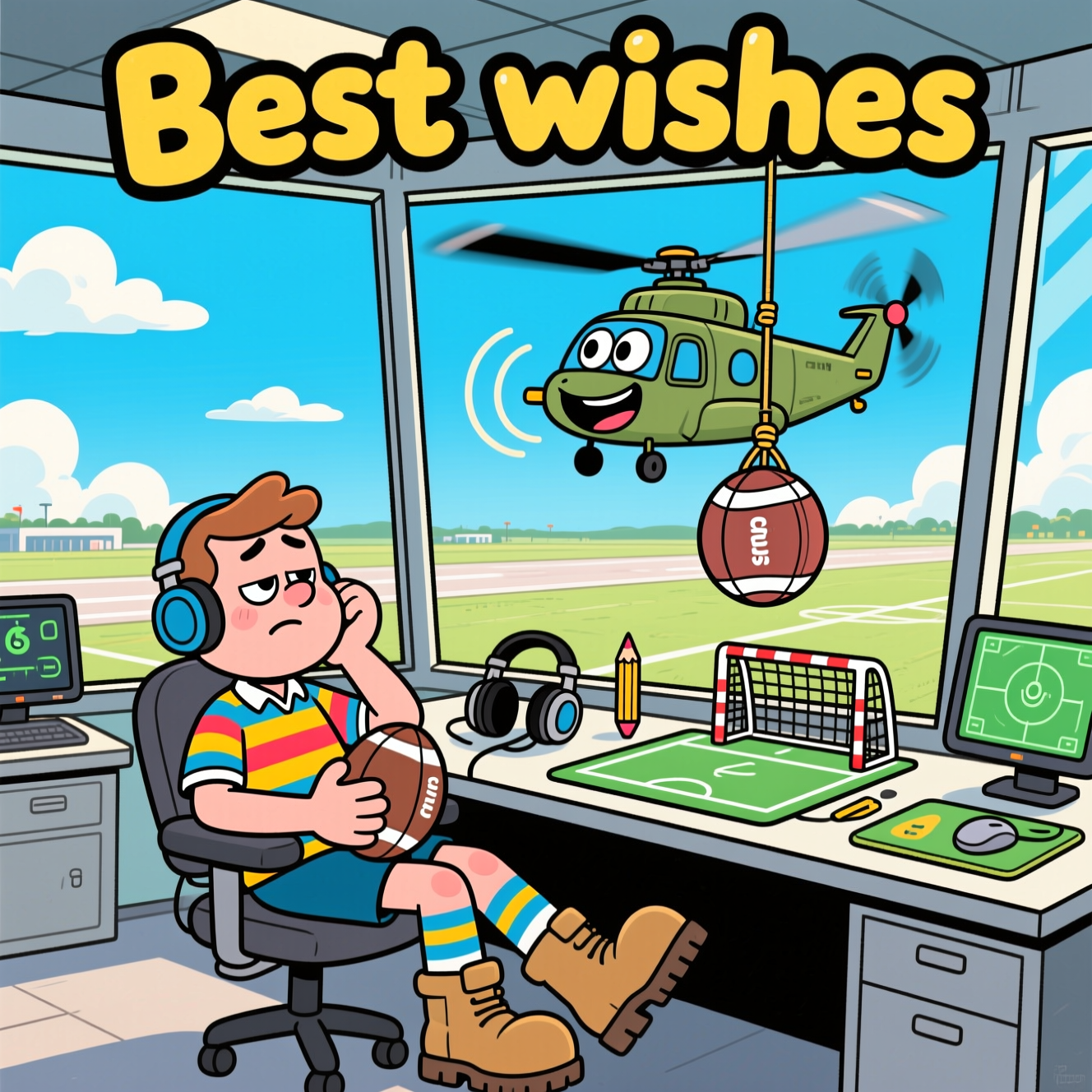 Funny farewell scene in a playful Cartoon Style: inside a quiet, sunlit air traffic control tower with tall wraparound windows and a panoramic view of a calm runway. Foreground: a bored air traffic controller with exaggerated proportions (big head, tiny legs), slouched in a swivel chair, cheek squished into one palm, eyes half-lidded and comically glazed. They’re wearing a bright, striped rugby jersey, with striped socks and chunky boots. One hand loosely holds a rugby ball; on the desk sit a headset, a mini pencil-made rugby goalpost, and a mousepad printed like a rugby pitch. Radar screens show simple, friendly shapes to emphasize the slow day.