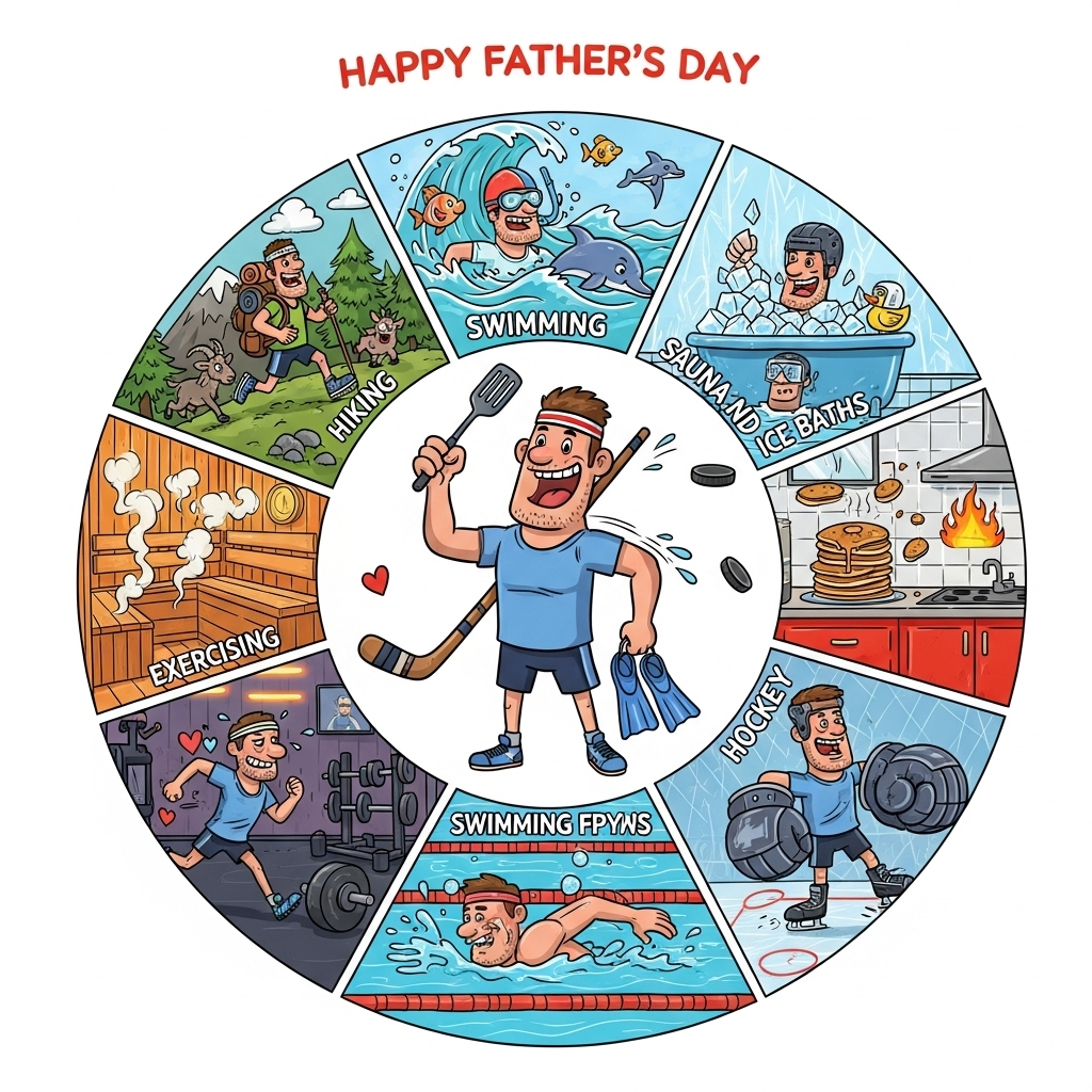 Hiking, Swimming in the ocean, Sauna and icebaths, Cooking, Exercising- running, gym and swimming, Hockey, and Fathers-day Card