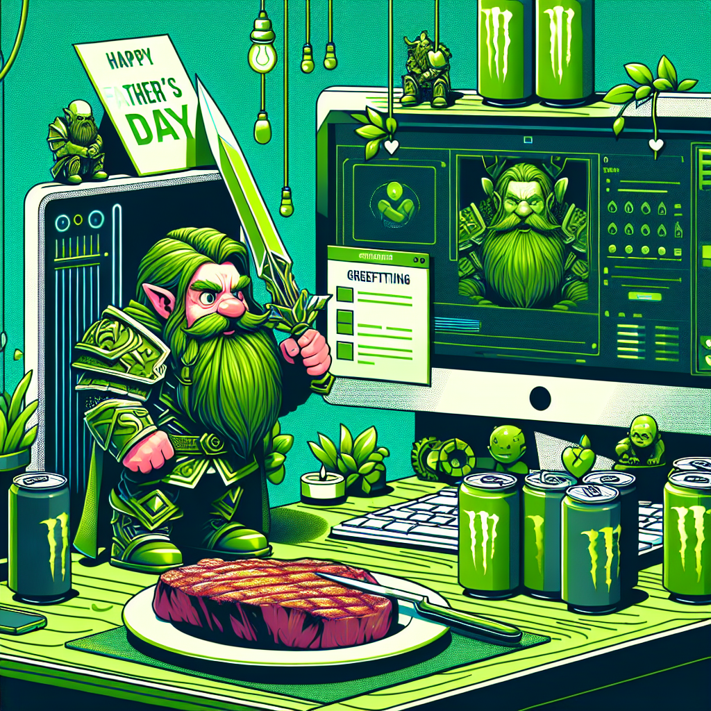 Create an image of a Father's Day vector design where a snug workspace drips with a dwarf warrior essence. There's a strong miniature figure representing such character adjacent to an advanced computer setup being put together. The room is drenched in the energetic green of energy drink cans gathered like flowers, with a 'Happy Father's Day' greeting card propped against the monitor. The focal point reveals a tempting steak on a plate, epitomizing the cheerfulness of the day.