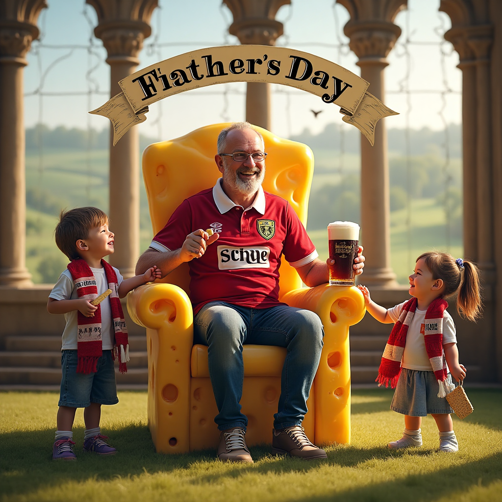 In the heart of the picturesque Yorkshire countryside, set against the backdrop of the iconic Life Church Bradford, a humorous and charming scene unfolds. A well-loved dad, sporting a Leeds United jersey, is the center of attention. He's perched on a grand throne made entirely of different types of cheese – from Wensleydale to Blue Stilton – with intricate carvings depicting famous Yorkshire landmarks.