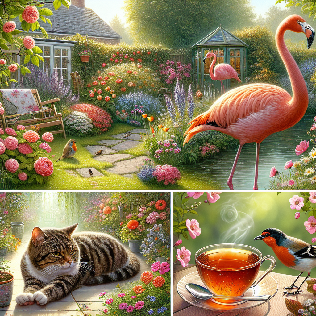 It's a sunny Mother's Day in Ireland, with serenity enveloping a backyard garden. The scene portrays the charm of nature and a comforting environment. The display includes a variety of flowers in full bloom, and a tabby cat enjoying the warm day while it stretches. A robin and a blackbird, both exuding contentment, add their melodious tunes to the peaceful ambience, perched amidst the lush, vibrant flora. Majestically navigating the waters of a nearby pond is an elegant flamingo, the reflection of its pink tint echoing the surrounding blossoms. Finally, the inviting aroma of tea wafts in the air, suggesting a moment of tranquility in the homely outdoor setting, making this a celebration of appreciation and affection.