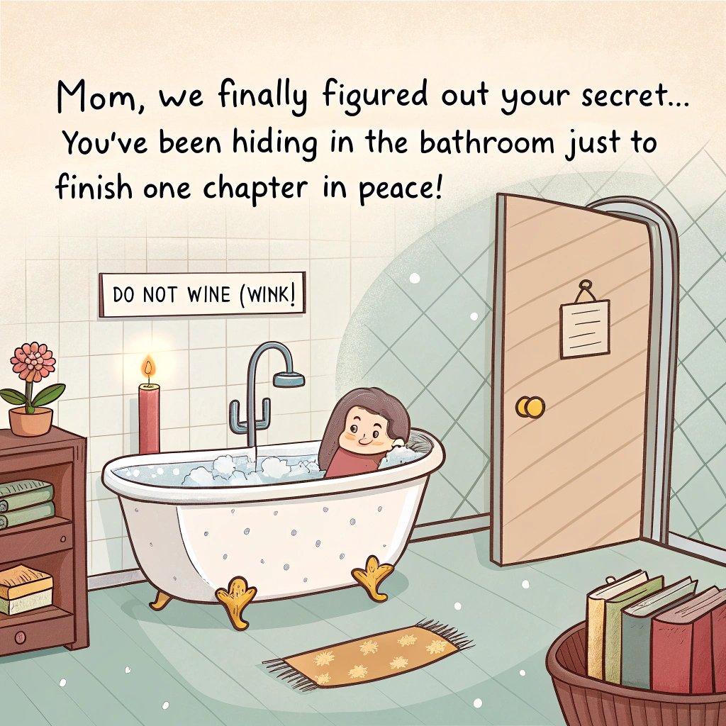 At the top of the image, "Momm, we finally figured out your secret… you've been hiding in the bathroom just to finish one chapter in peace!"