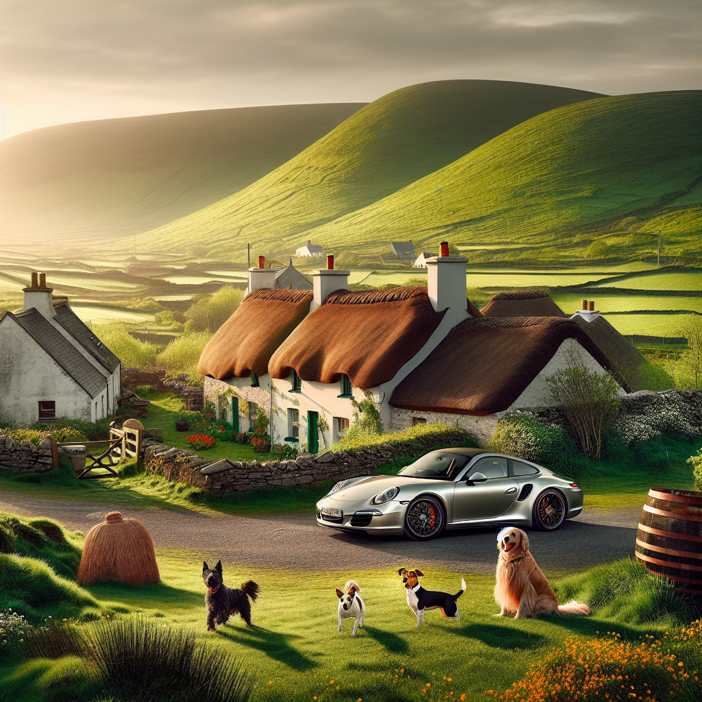 Picture a tranquil spring morning in the Irish countryside. The landscape is covered in a soft glow, with emerald green hills as the background for the scene. Thatched-roof cottages, painted with the charm of rustic living, are scattered across these hills. Interspersed among the hills and cottages are vibrant wildflowers, adding pops of color throughout the verdant landscape. Parked in front of one of the cottages, there's a sleek Porsche, its polished surface gleaming under the optimistic sunlight. A playful group of dogs, including an exuberant Irish setter and a lively Jack Russell terrier, are romping in the grass nearby, their enthusiastically wagging tails capturing the joyful ambience of the morning.