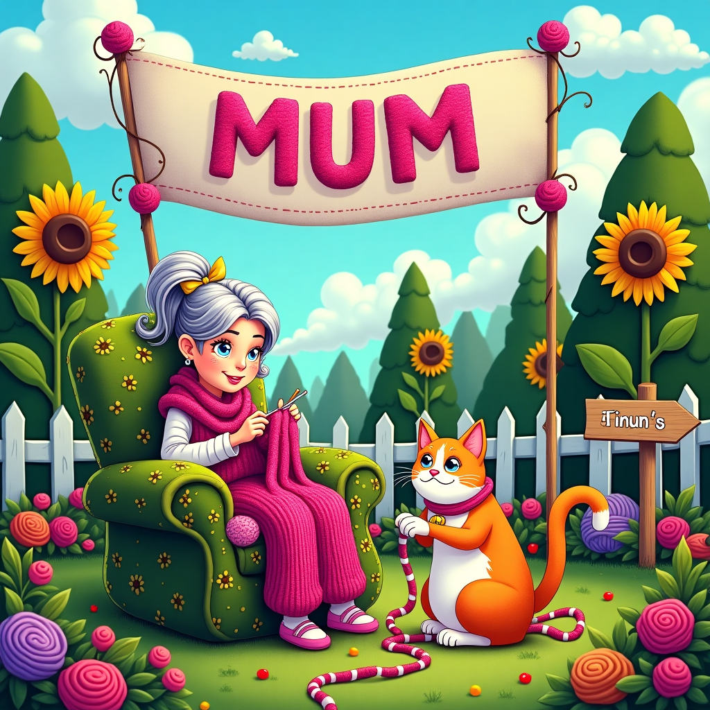 In the center of this lively scene, a large banner flutters between two towering garden stakes. The banner is stitched to resemble a knitted masterpiece, and it proudly displays the text "MUM" in bold, cheerful letters made from bright pink yarn that appears almost three-dimensional.