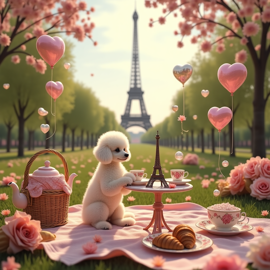 A surreal and dreamy spring picnic scene set in a lush Parisian park beneath the Eiffel Tower, glowing faintly with a pastel pink aura. In the center of the image, a white, fluffy poodle sits upright at a miniature café table, delicately holding a china teacup in one paw. All around, love hearts made of transparent soap bubbles float whimsically through the air, reflecting rainbow hues.