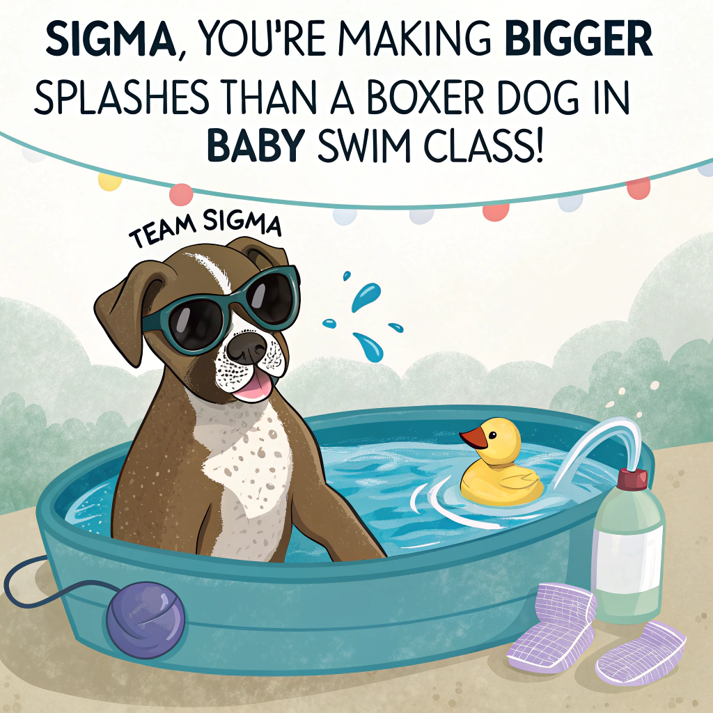 At the top of the image, "Sigma, you're making bigger splashes than a boxer dog in baby swim class!"