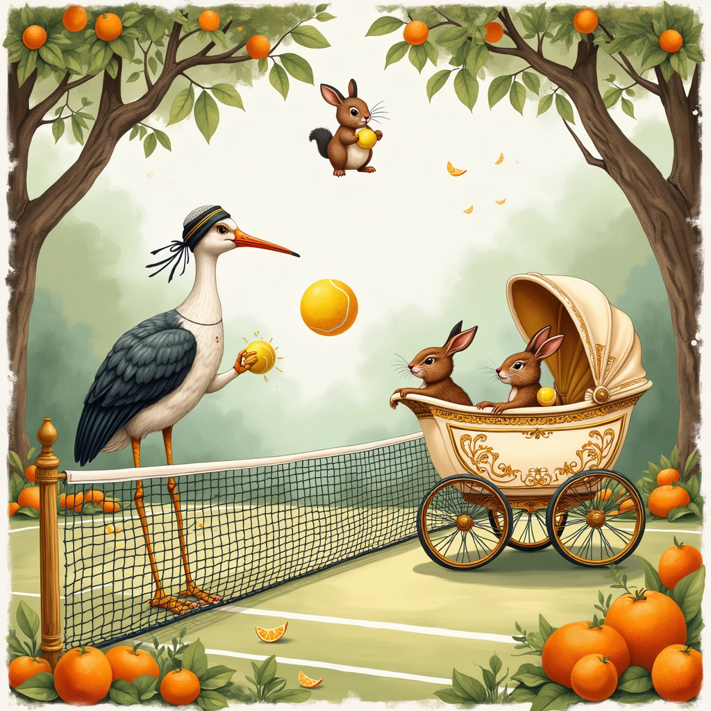In the whimsical scene set on the front cover of a new-baby greetings card, imagine an enchanting tennis court nestled within an idyllic, sun-dappled garden. The net is festooned with delicate garlands of croissants and playful clusters of oranges. On one side of the net, a charming stork dressed as a tennis player, complete with a headband and tiny sneakers, serves an oversized banana as if it were a tennis ball, the peel fluttering like ribbons in the wind. On the opposite side, a delightful family of rabbits, reminiscent of Beatrix Potter’s style but with a quirky twist, eagerly await the banana ball. The father rabbit, wearing a Victorian tennis outfit with a waistcoat and bow tie, stands ready with a racquet that looks like it's made of braided croissant dough.