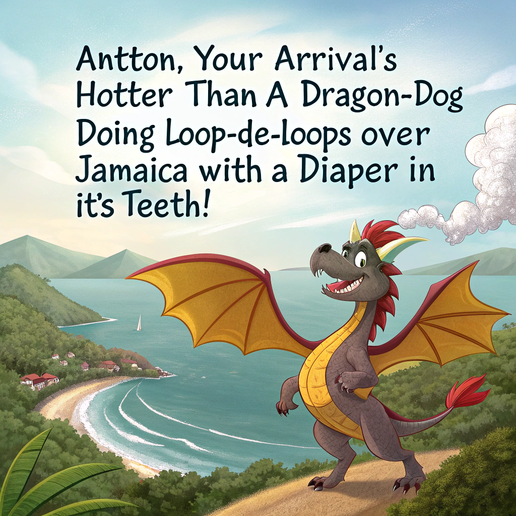 At the top of the realistic photograph image, "Antton, your arrival’s hotter than a dragon-dog doing loop-de-loops over Jamaica with a diaper in its teeth!"