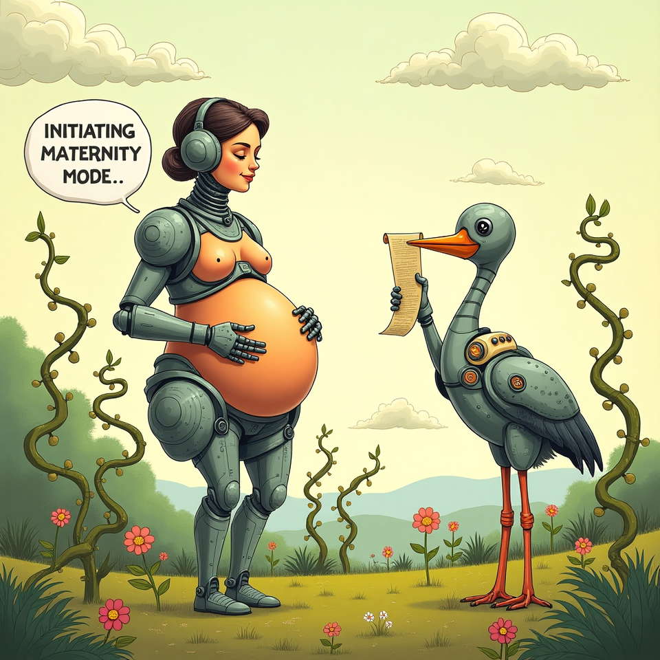 In a whimsical landscape that seems like a blend between a 1950s sci-fi movie set and an enchanting nursery rhyme, the scene unfolds in the foreground with a playful, almost mechanical meadow. Standing prominently is a humorously depicted pregnant woman, her belly transparently illustrated to show a tiny baby nestled inside. The baby, not resting as you'd expect, is instead shown wearing a cartoonish robotic exoskeleton, complete with oversized control panels, joysticks, and tiny screens. The baby is joyfully pushing buttons and pulling levers, with a cheerful determination, clearly in charge of its own destiny. Above the baby's head, a speech bubble humorously declares, "Initiating Maternity Mode...".