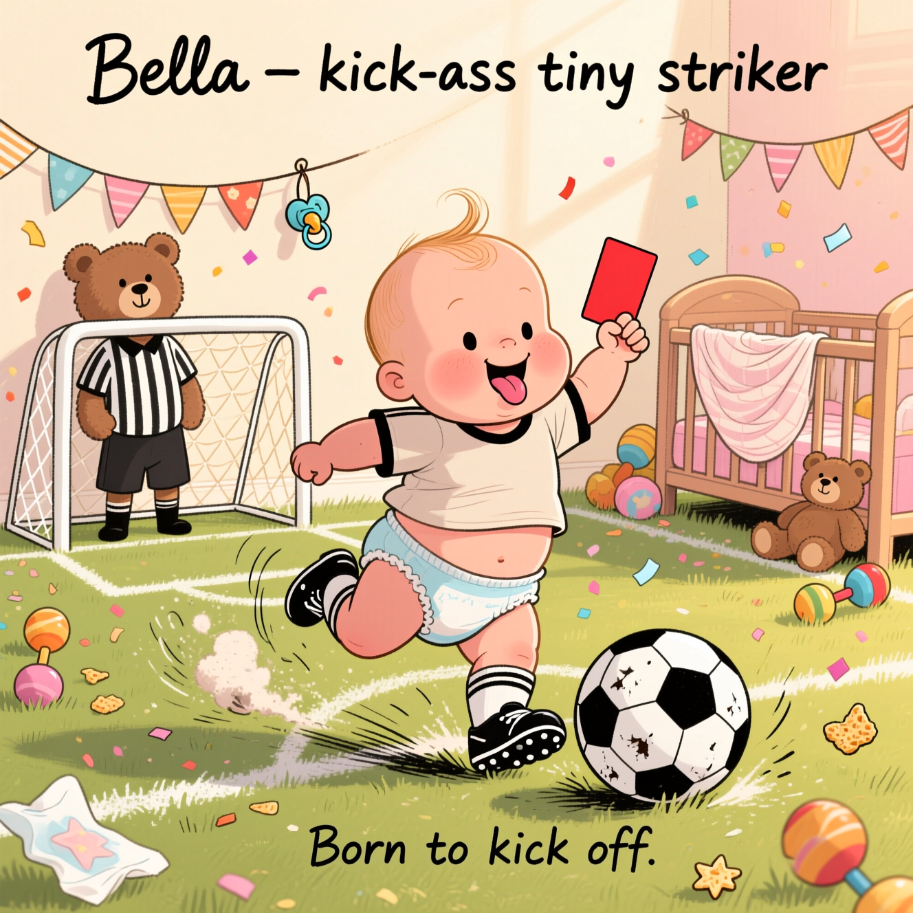 Image-first, portrait composition. A large, hand-drawn illustration of a feisty newborn on a playful soccer pitch made from nursery props. Center stage: a chubby baby in a soft, tiny soccer kit (plain jersey, diaper, little booties that hint at studs), captured mid-kick as a classic black-and-white ball zips forward with sketched motion lines and a puff of chalky turf. Her expression is cheeky and defiant—brow scrunched, tongue sticking out, one little fist raised brandishing a miniature red card toward a bewildered teddy-bear “referee” by a crib-rail goal strung with a gauzy swaddle net. Plush toys and rattles ring the pitch like rowdy fans; a pacifier dangles and flutters like a pennant as she moves; confetti-like baby wipes and star-shaped snack puffs add comic chaos. Rude mood through swaggering stance, scuffed ball, and irreverent attitude—no gore, no nudity.