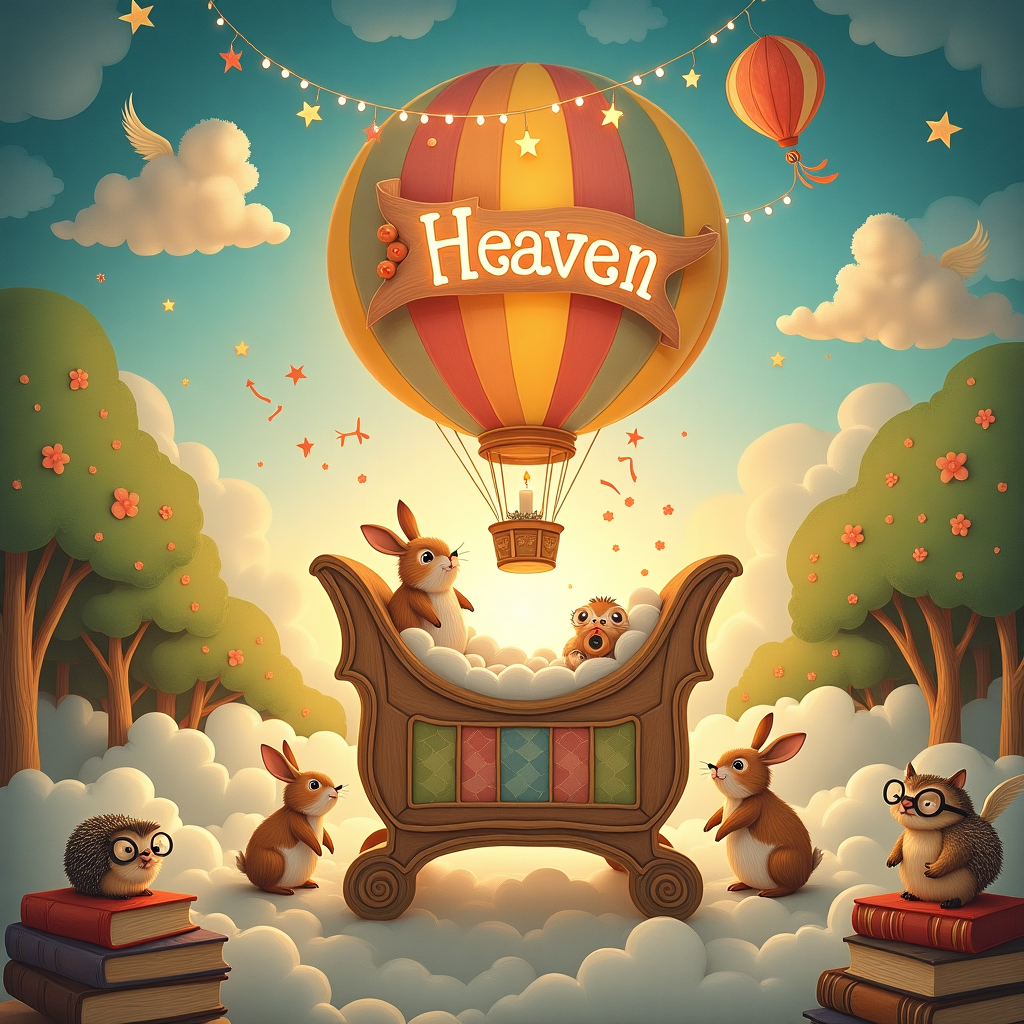 The scene unfolds in a whimsical nursery, reminiscent of a vibrant storybook illustration. At the center, a charming crib shaped like a vintage hot air balloon rests gently on the fluffy clouds, its basket adorned with colorful patchwork patterns and soft, fluffy pillows. Floating just above the crib is a delicate string of twinkling stars, with the name "Heaven" carefully crafted in glowing, pastel-colored letters that arc gracefully across the sky, as if painted by an unseen celestial hand.