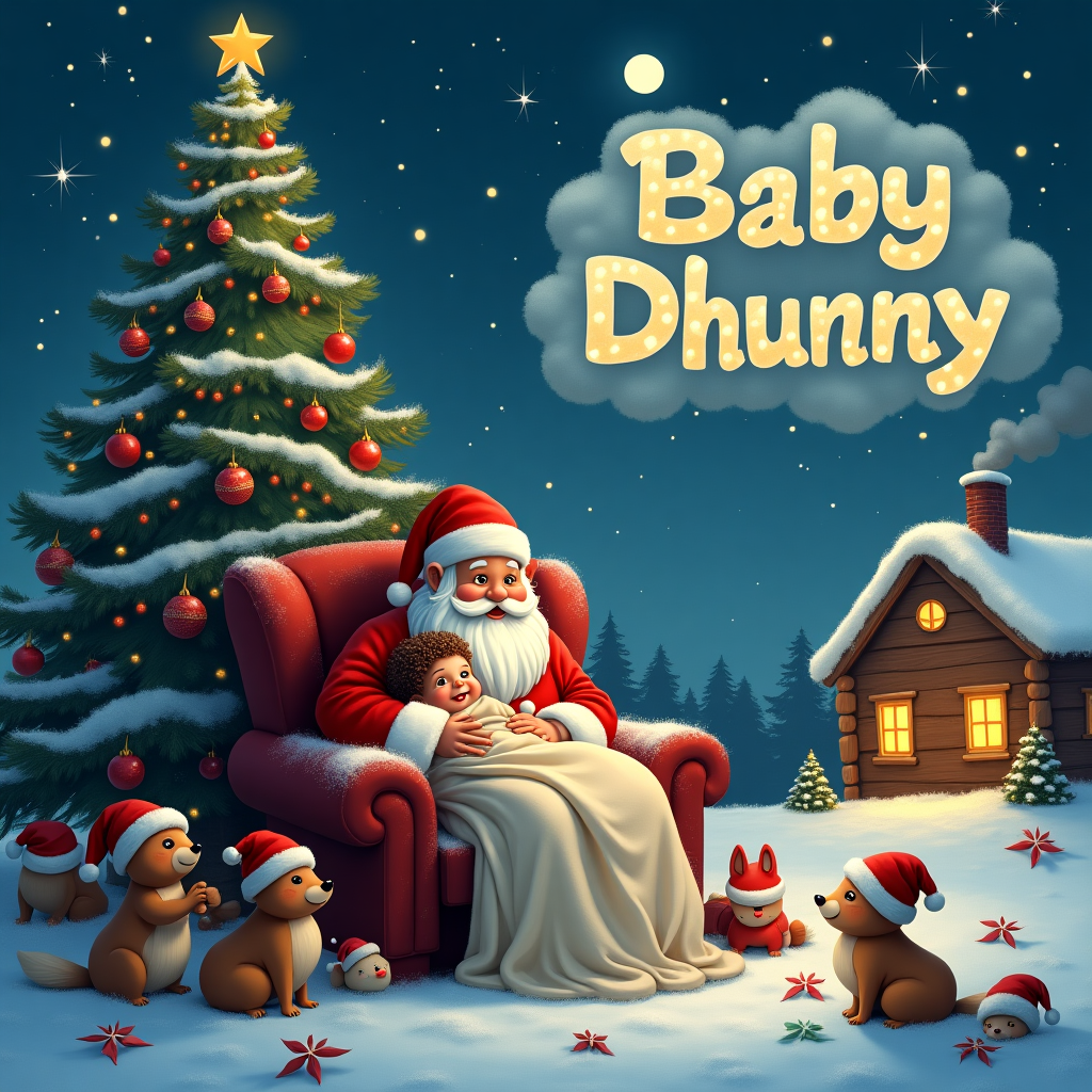 In a whimsical winter wonderland, the scene captures a snowy Christmas evening in the year 2025. Nestled beneath a towering, twinkling Christmas tree adorned with luminescent baubles and shimmering tinsel, sits Santa Claus on a plush, oversized armchair, its fabric a rich, deep crimson to match his iconic suit. Cradled gently on his lap, wrapped snugly in a soft, creamy blanket with delicate snowflake patterns, is Baby Dhunny, her small head peeking out, revealing a tuft of curly brown hair. Surrounding them is a circle of happy woodland creatures, each wearing tiny Santa hats, adding an enchanting touch to the scene.