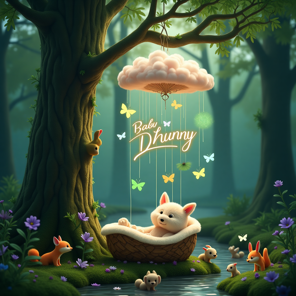 Hovering above the scene, a misty cloud formation gracefully spells out the name "Baby Dhunny" in playful, fluffy script, resembling cotton candy against the morning sky. Below this celestial greeting, a quaint wooden cradle, woven from the forest's natural vines and leaves, cradles a plush toy shaped like a mythical forest creature—perhaps a tiny dragon with soft, velvety scales and a mischievous glint in its button eyes.
