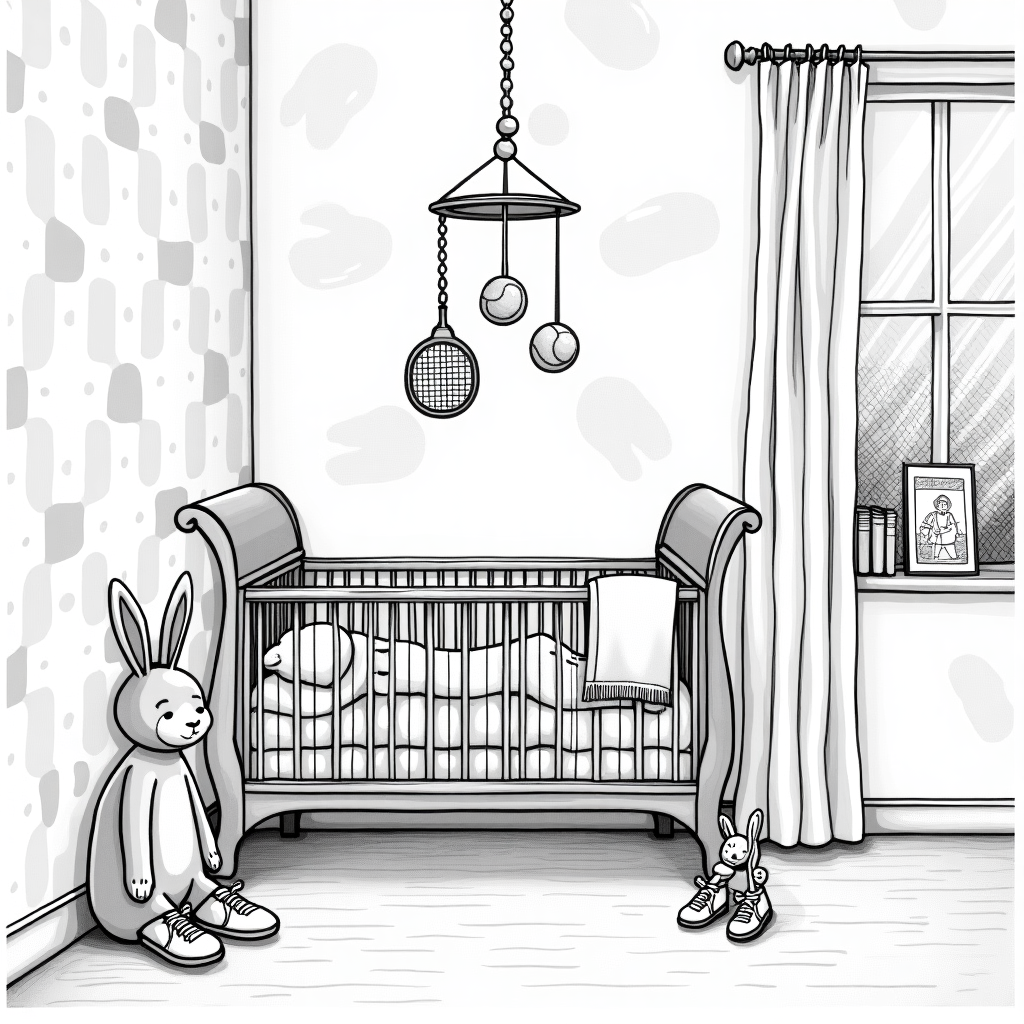 In this whimsical line drawing, we enter a cozy nursery filled with charming details that celebrate a new baby born to tennis-loving parents. At the center, a vintage wooden cot with curved spindles and a softly woven blanket cradles the sleeping baby. Above, a mobile of delicate tennis balls and tiny rackets gently sways, casting playful shadows on the walls. The walls themselves are decorated with illustrated tennis court motifs, cleverly interwoven with playful elements from classic children’s tales. A pair of tennis shoes—one belonging to each parent—rests casually by the cot, their laces tied together in a subtle nod to their bond. Nearby, a beloved Beatrix Potter-style stuffed bunny sits upright, holding a mini racket, adding a touch of whimsy and character. On a small shelf, children's books, including an illustrated tennis handbook, stand next to a framed black and white photograph of the parents on a tennis court, their faces animated and joyful. A window with sheer curtains allows soft sunlight to filter in, casting intricate patterns reminiscent of Arthur Rackham’s intricate linework across the room. The nursery exudes a sense of warmth and creativity, capturing the story of a family whose love for tennis is woven seamlessly into their new chapter.
