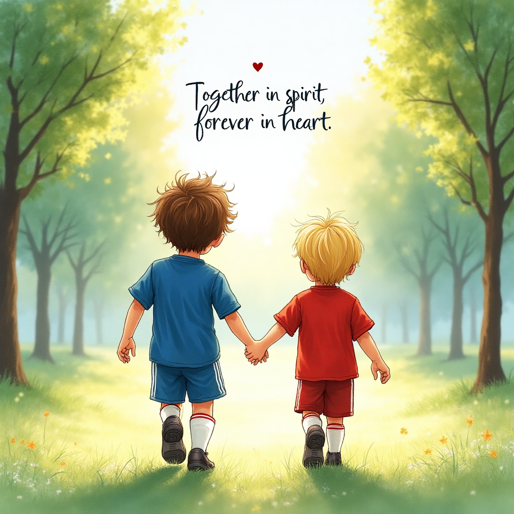 In a serene, sun-dappled park setting, two little boys walk hand in hand, seen from behind to evoke a sense of gentle camaraderie and youthful innocence. The taller boy, with tousled brown hair, wears a blue football kit, while the shorter boy, with golden-blond locks, sports a red football kit. The scene is captured in a soft watercolor style, with delicate gradients blending the greens of the park, the blues of the sky, and the vibrant hues of their kits. The watercolor technique allows for natural blooms and a textured paper feel, enhancing the sincerity of the moment. Above the boys, nestled gently within the sky, is a simple yet heartfelt caption in delicate script: "Together in spirit, forever in heart."