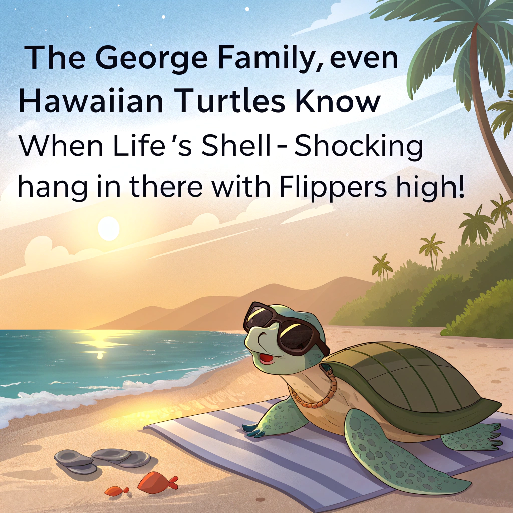 At the top of the image, "The George Family, even Hawaiian turtles know when life’s shell-shocking — hang in there with flippers high!"
