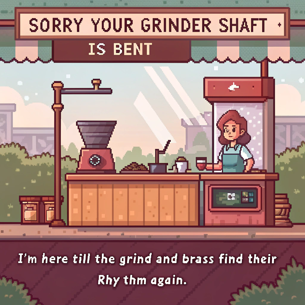 - Scene: A quiet café countertop at dawn. Center-left sits a manual burr coffee grinder with a subtly bent crank shaft, a few scattered beans around it. Center-right, a trombone leans gently against the counter, its slide resting low, bell softly catching light.