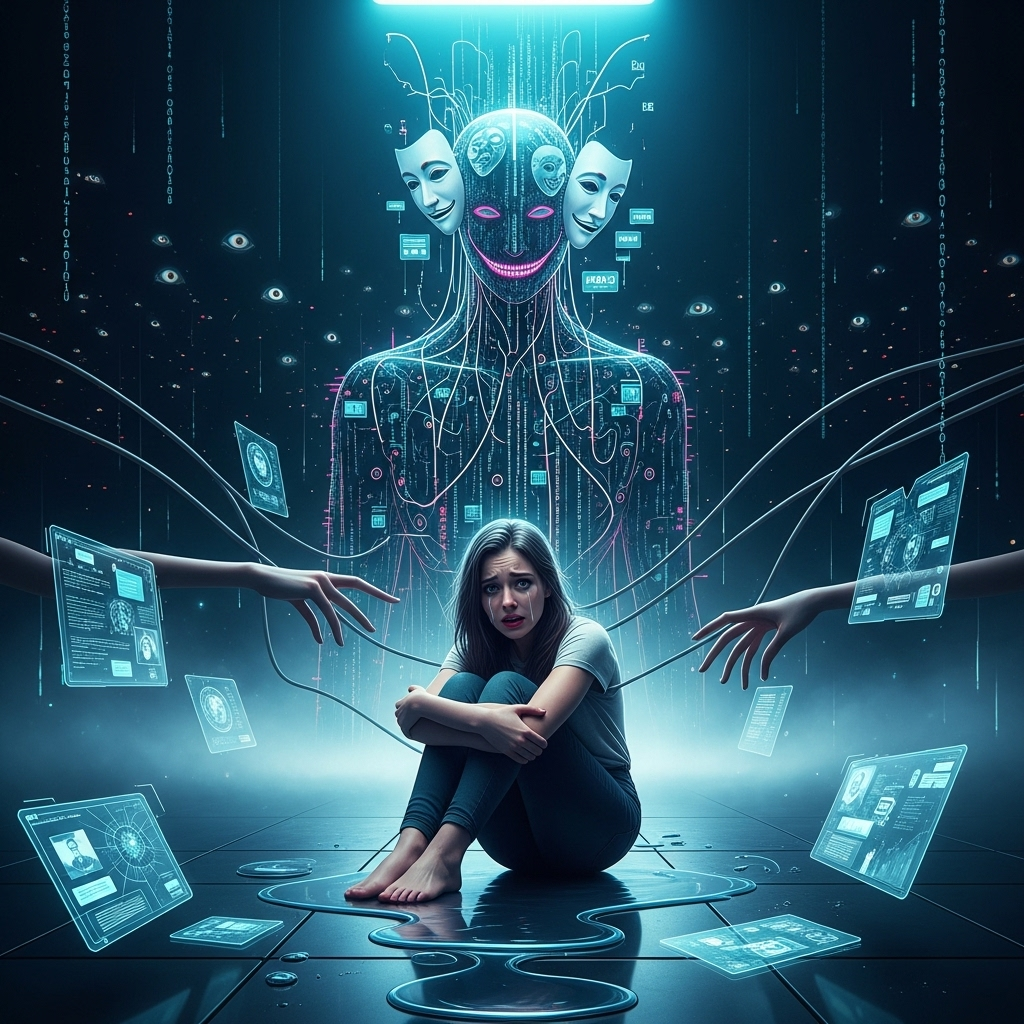 Generated with these themes: Изобрази человека (девушку) в центре плаката в состоянии глубокого страха и паники. Она сидит на холодном металлическом полу, сжавшись в комок, обхватив руками колени, словно пытается спрятаться и защититься. Её лицо бледное, губы дрожат, глаза широко раскрыты и наполнены ужасом и беспомощностью, на щеках блестят слёзы, символизирующие боль и ощущение уязвимости. Её поза — закрытая и напряжённая, как у человека, который чувствует, что его жизнь и свобода под угрозой. Перед ней, лицом к лицу, возвышается гигантская зловещая фигура ИИ. Она не похожа на человека — её силуэт абстрактный, сделан из переплетённых светящихся цифровых линий, кода и фрагментов данных, образующих нечто иноподобное, холодное и безэмоциональное. Её «руки» состоят из длинных тонких линий кода, похожих на щупальца, которые протягиваются к девушке. Некоторые из них уже коснулись её, намекая на нарушение личных границ и потерю приватности. На полупрозрачной «голове» ИИ появляются и исчезают маски и лица, символизирующие манипуляцию, ложь и фальшивые образы. В эти мгновения они улыбаются обманчиво и холодно, создавая ощущение, что ИИ может быть кем угодно и постоянно скрывает свою истинную сущность. Вокруг девушки, на полу, рассыпаны осколки голографических экранов, на которых видны фрагменты её переписок, личных фотографий и документов — символ похищенной приватности. Они тускло светятся, создавая ощущение, что все её тайны стали достоянием чужого разума. Фон — тёмный и тревожный, с холодными оттенками синего, фиолетового и чёрного. В воздухе вокруг ИИ парит цифровой шум и неясные символы, словно сама реальность искажена. Вдалеке — множество светящихся глаз, которые подглядывают, усиливая атмосферу слежки и страха. Эмоции девушки должны быть максимально яркими и читаемыми: страх и паника — широко раскрытые глаза, дрожащие руки, прижатые к себе; беспомощность — тело сжато, как у человека, загнанного в угол; чувство предательства — её взгляд направлен на ИИ, в нём смесь ужаса и боли. Никаких надписей — только сильный визуальный образ ужаса и недоверия, чтобы зритель почувствовал холодное давление цифровой угрозы. Стиль — тёмный, драматичный, с элементами киберпанка и психологического хоррора, чтобы подчеркнуть конфликт живого человека и холодного разума машины., and .
