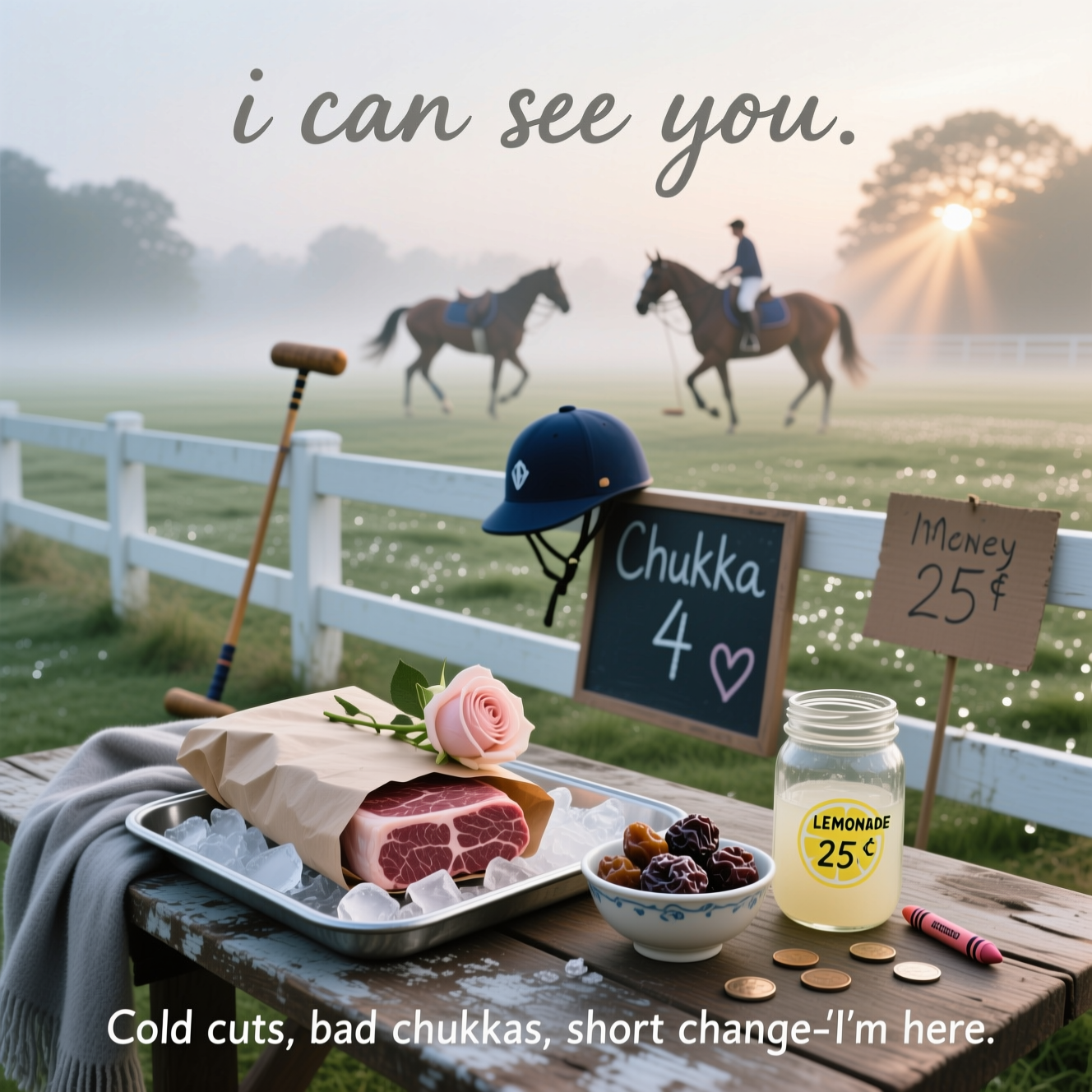 Ultra-high-definition 4K UHD, lifelike photorealistic camera capture with accurate natural dawn light and a rich sense of depth. Scene: a misty, early-morning polo field. Foreground focus on a weathered wooden sideline table: a chilled metal tray with crushed ice and a neatly folded butcher-paper parcel slightly parted to reveal a hint of marbled cold raw beef (subtle, non-graphic); beside it, a small vintage porcelain bowl of wrinkled prunes with a faint white mold bloom; a single pale blush rose laid across the parcel and a soft dove-gray scarf draped over the table edge for a romantic, sympathetic tone. To the right, a tipped mason jar with a child’s crayon label “LEMONADE 25¢,” mostly empty, a few coins spilled, and a small hand-drawn cardboard sign fluttering on the nearby fence—implying the money was taken. Midground: a white rail fence with a polo mallet leaning and a navy helmet perched; a chalkboard reads “Chukka 4” with a tiny chalk heart in the corner. Background: dew-sparkled grass and two polo ponies cantering in soft motion blur through low morning mist, sunrays filtering through trees. Color palette: cool blues, soft grays, and blush accents; gentle bokeh; 50mm prime look, shallow depth-of-field with crisp textures on the still life and dreamy background separation. Text styling: top line in delicate ivory handwritten script, lightly translucent; bottom line in warm gray elegant serif, small and understated.