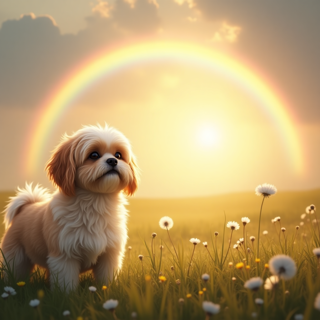 Generated with these themes: Gold and white shi tzu crossing the rainbow bridge .