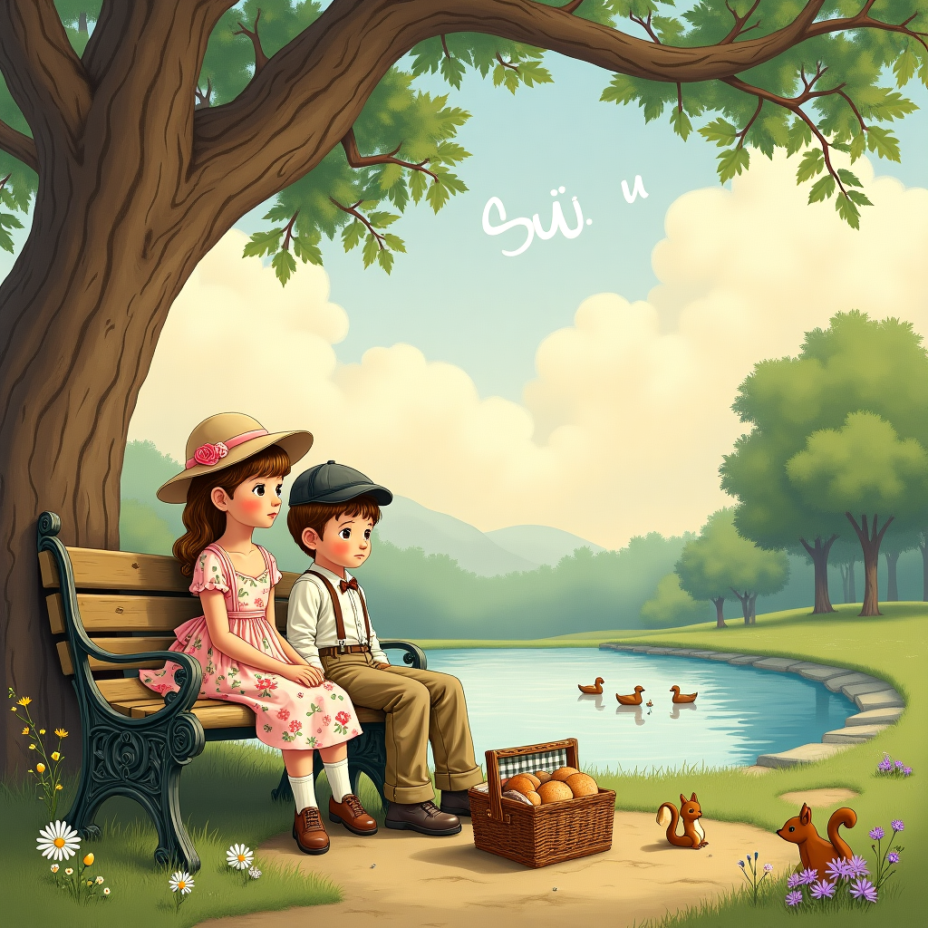 Foreground: The girl and boy sit side by side on an old-fashioned wooden park bench, much like the kind found in classic children's book illustrations by Beatrix Potter. The girl is wearing a vintage-style floral dress in pastel pinks and greens, with a wide-brimmed hat adorned with a single pink rose. The boy sports a classic newsboy cap, a simple white shirt, and suspenders, with rolled-up khaki trousers.