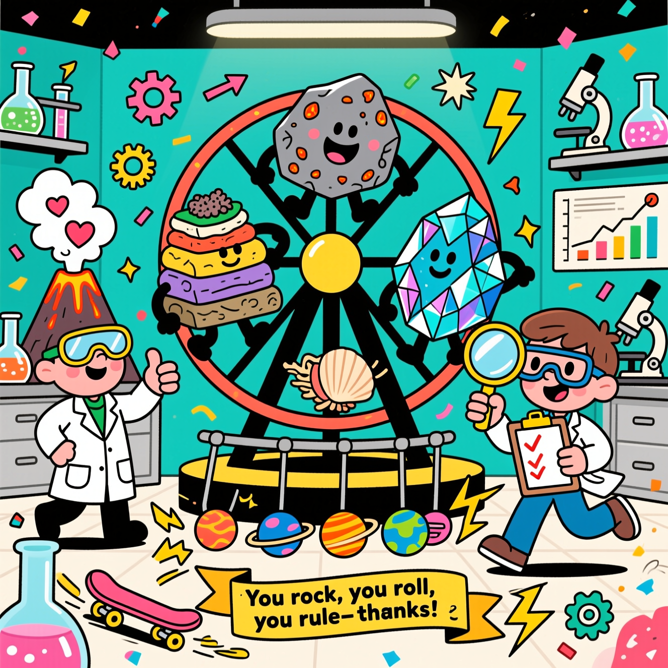Playful cartoon, bright saturated colors, thick black outlines, exaggerated proportions, whimsical energetic poses. Full-bleed scene in a lively science lab. Center stage: a giant circular ride visually representing the rock cycle, where three personified rocks loop around like a Ferris wheel—(1) Igneous rock with tiny lava freckles and a cheeky grin, (2) Sedimentary rock made of stacked layers with a cute fossil shell peeking out, (3) Metamorphic rock sparkling with crystal facets and cool shades. Left: a friendly volcano in safety goggles and a lab coat, puffing heart-shaped steam and giving a thumbs-up. Right: an enthusiastic 5th-grade scientist with oversized goggles peering through a huge magnifying glass, holding a clipboard with big checkmarks (no words). Foreground: a Newton’s cradle made of colorful planets swinging with swoosh lines; a cartoon skateboard zooms by trailing lightning bolts and spirals to suggest energy and motion. Scattered visual icons (arrows, springs, gears, lightning, motion lines) float playfully to illustrate force/motion/energy—no labels. Background: teal lab walls with beakers bubbling, a microscope, and pictogram-style charts (no text), plus confetti-like atoms, stars, and sparkles. Lighting bright and bouncy; dynamic, funny expressions.