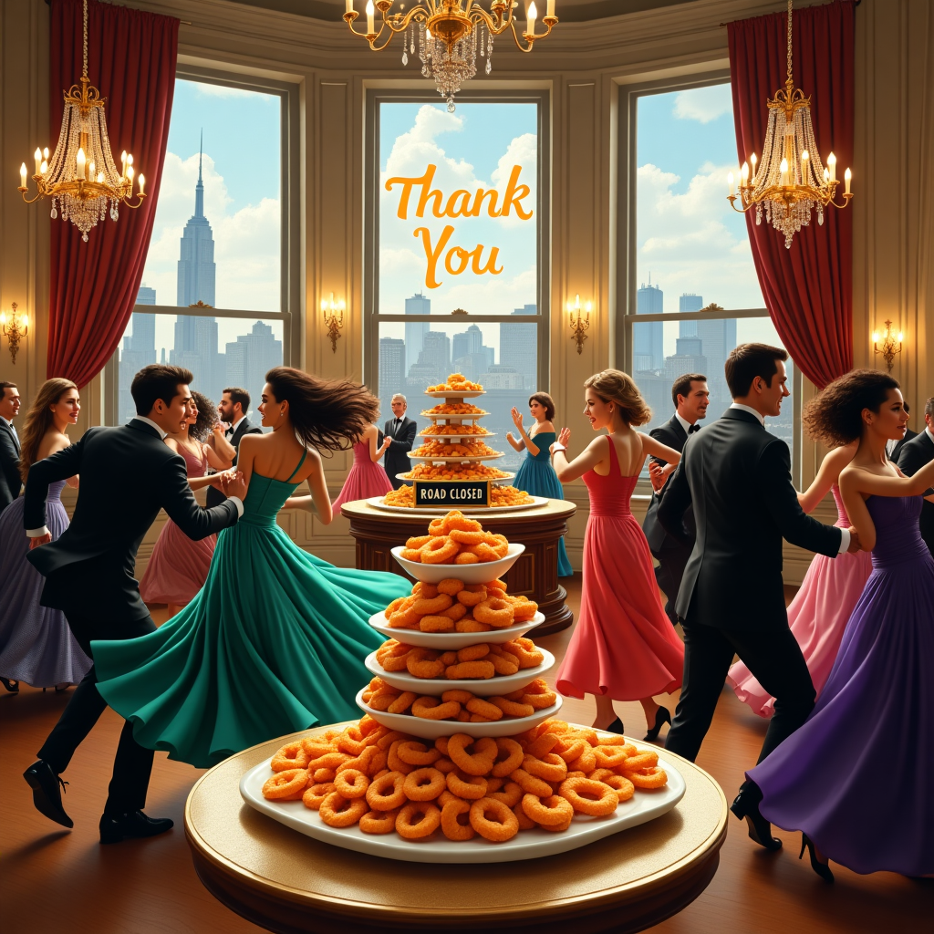 Large white glass oblong dishes with fried shrimp, High energy Dancing in different colors and styles of formal wear with various races in a large rustic but elegant room, Road closed, and New York skyline Thank-you Card
