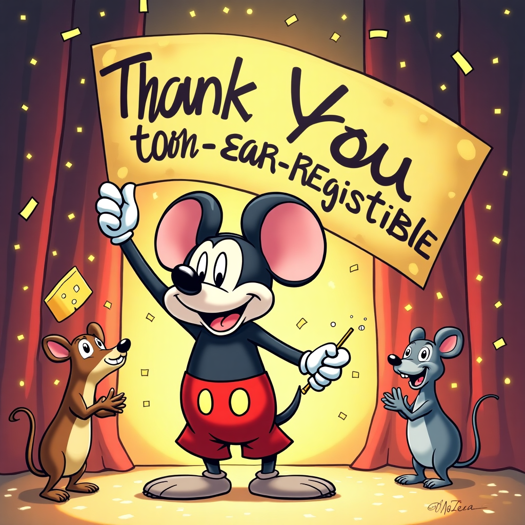 A funny, colorful cartoon-style illustration featuring a cheeky mouse character wearing white gloves, red shorts, and oversized round ears (evoking a Mickey Mouse parody, but distinctly original to avoid copyright), dramatically bowing on a sparkly stage. Confetti rains down as he presents an oversized "Thank You" banner. A few woodland animal sidekicks clap wildly in the audience, and one throws a slice of cheese like a bouquet. The mood is playful, silly, and joyfully over-the-top.