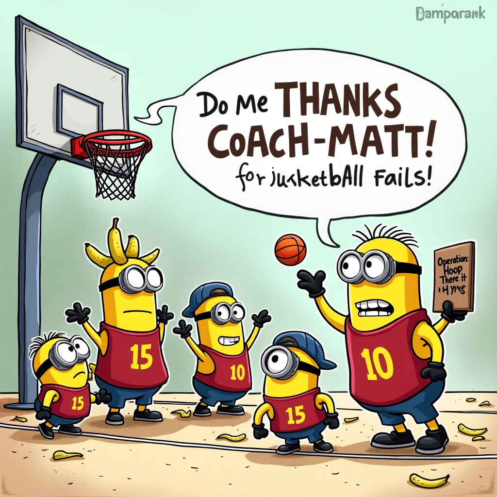 At the top of the cartoon image: **"Thanks Coach Matt – for Minion-imizing our basketball fails!"**