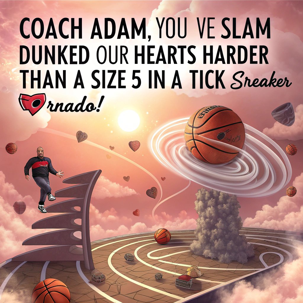 At the top of the image, "Coach Adam, you’ve slam dunked our hearts harder than a size 5 in a Tick sneaker tornado!"
