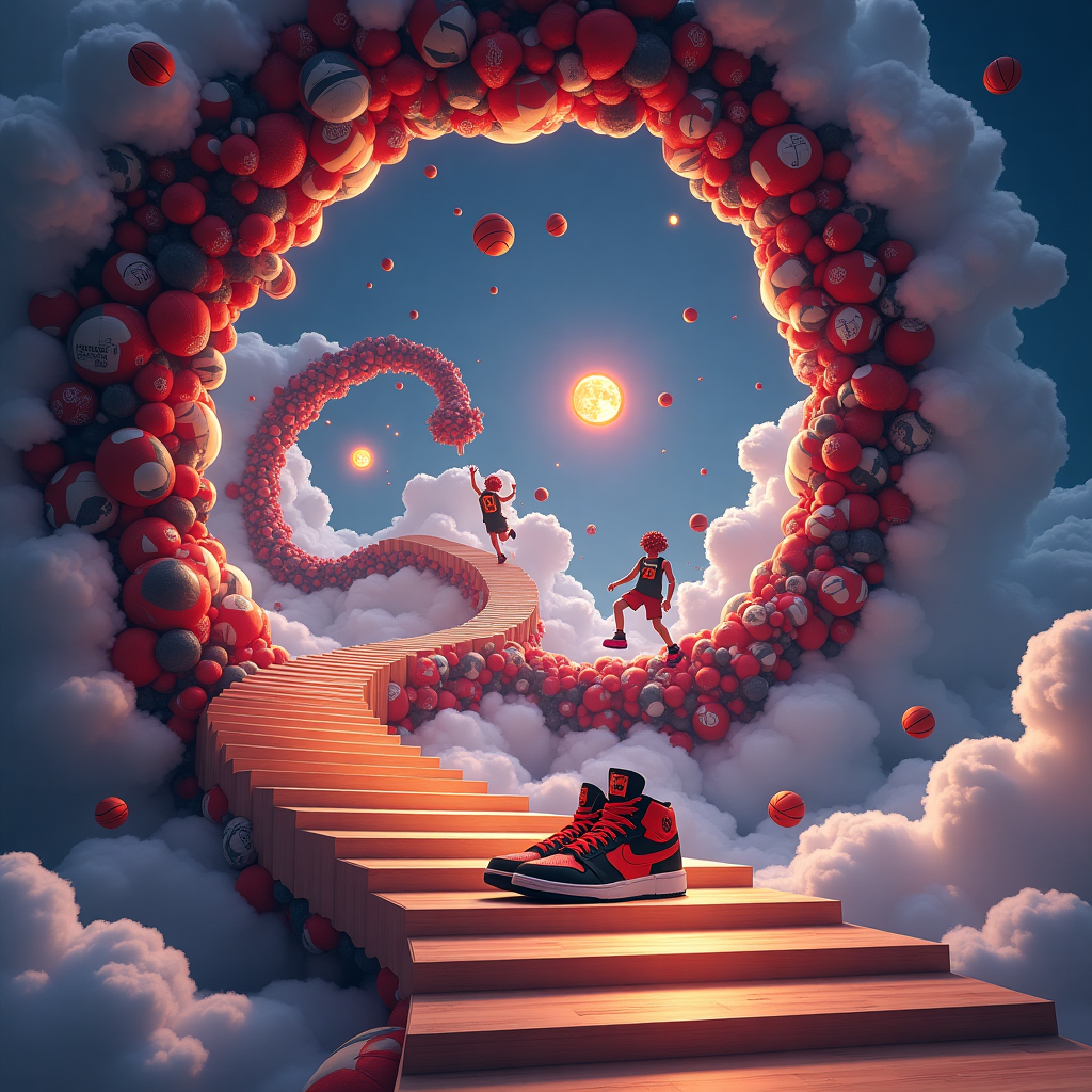 A surreal, dreamlike landscape where enormous floating sneakers with wings hover above a basketball court that spirals upward like a helix into the clouds. Each step of the helix is formed from fragments of Blazers jerseys in vibrant red, black, and white, glowing subtly. Basketballs rain gently from above like meteor showers, some bouncing on impossible angles, some floating in orbit. In the background, abstract human figures with sneaker soles for heads play basketball in zero gravity, mid-air dunking toward flaming hoops shaped like halos. In the center, a pair of giant sneakers rest side-by-side on a pedestal made of polished parquet court wood, glowing softly — symbolic of Coach Adam's impact. The atmosphere should feel playful, whimsical, and surreal, as though rules of gravity and scale have melted away. A palette of twilight purples, bold reds, and dreamlike blues heightens the abstract and surreal vibe.