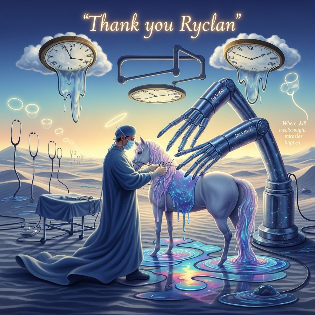 A dreamlike, Dali-inspired operating theatre stretches across a rippling desert of glassy sand, where time feels fluid and shadows bend in impossible curves. In the centre, a gentle-eyed male surgeon—dressed in a coat that drapes into flowing rivers—works alongside a pair of sleek, chrome mechanical arms named *Da Vinci*, each joint adorned with tiny constellations that sparkle softly. They are tenderly performing surgery on a snow-white unicorn whose mane cascades like liquid rainbows, pooling at their hooves into surreal puddles reflecting impossible skies. Floating above are giant clock faces melting into clouds, and in the distance, a line of stethoscopes sway like flowers in a warm, shimmering breeze. Ethereal light streams in from nowhere, bathing the scene in soft pastels and luminous halos, imbuing it with a deep, sincere gratitude and wonder.