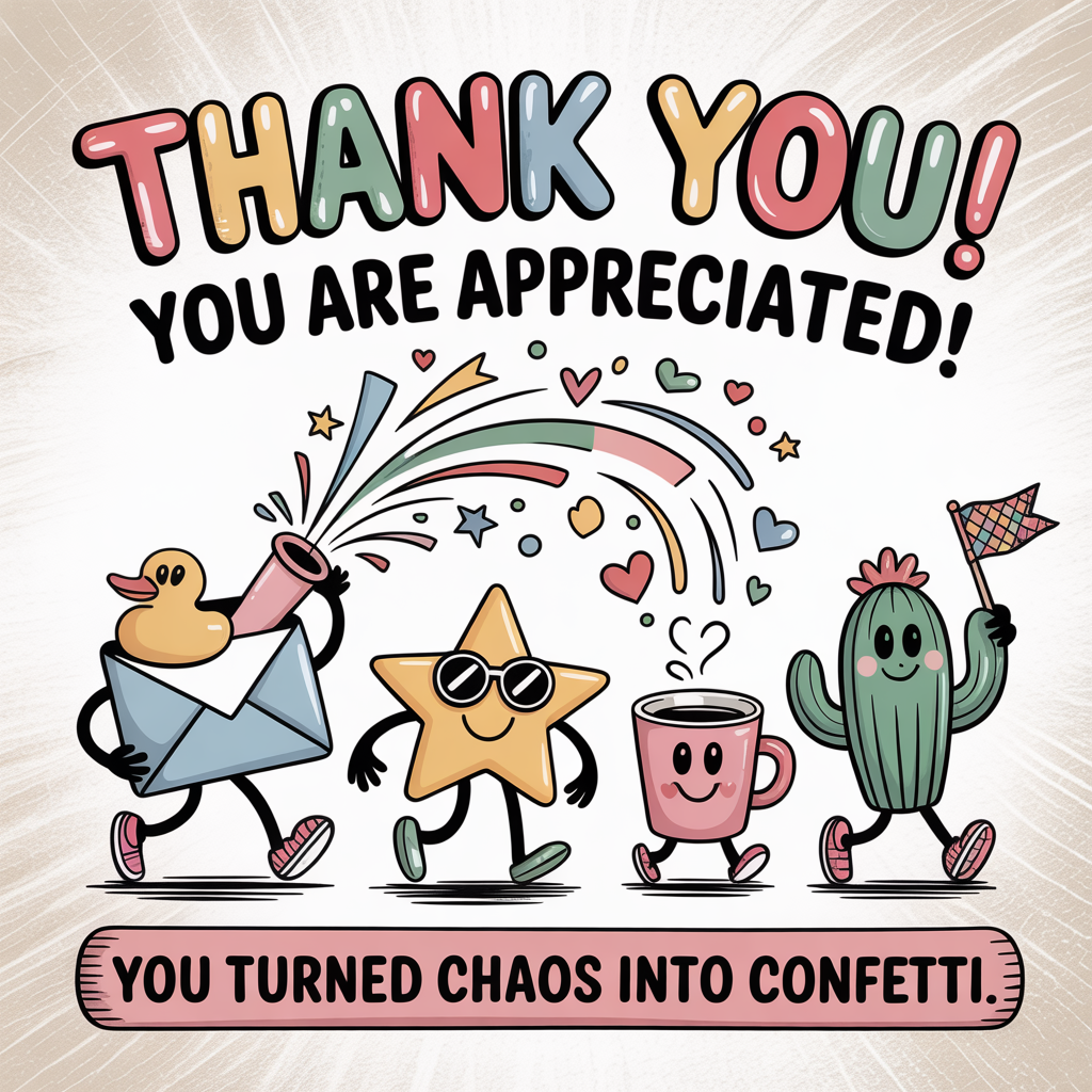 Scene: In the middle, a playful “thank-you parade” marches across the page. A smiling envelope acts like a confetti cannon, puffing out heart, star, and checkmark-shaped confetti that arcs upward toward the headline and swirls back down to the punchline. Beside it, a beaming gold star with sunglasses, a cheerful coffee cup with steam shaped like a tiny heart, and a bashful cactus waving a little patterned pennant (no words) all prance along. Add a rubber duck in a party hat riding a tiny skateboard for an extra giggle. Keep the characters charming, simple, and expressive.