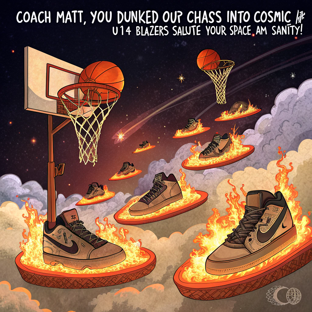 At the top of the abstract image, "Coach Matt, you dunked our chaos into cosmic lay-ups—U14 Blazers salute your space-jam sanity!"