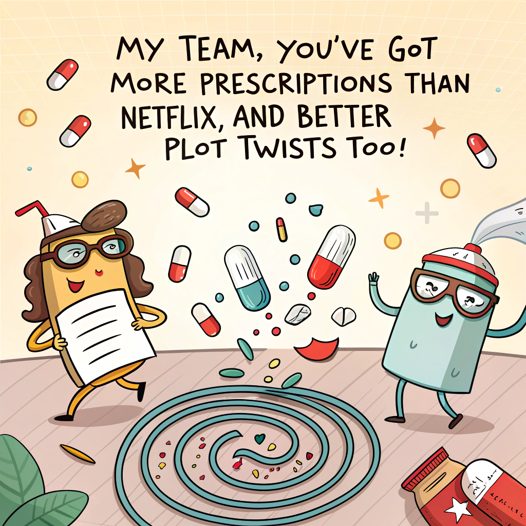 At the top of the image, "My Team: You’ve got more prescriptions than Netflix, and better plot twists too!"